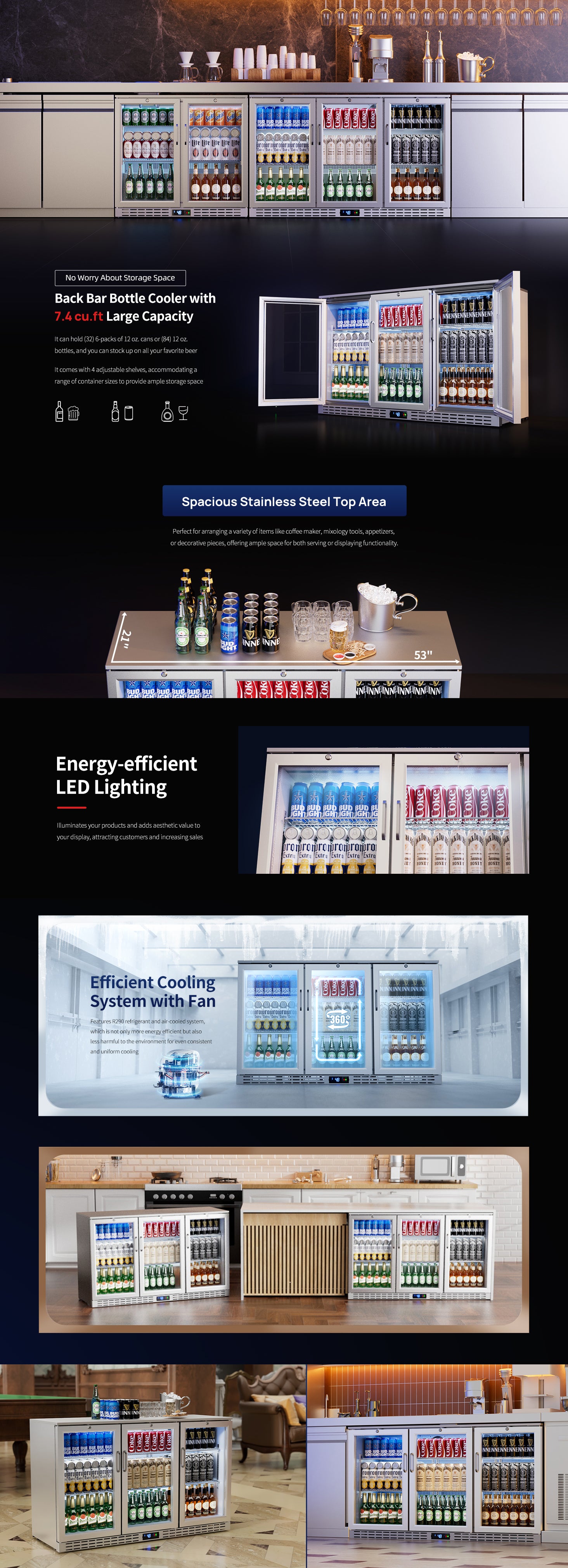 • Efficient Cooling & Auto Defrost: Utilises R290 refrigerant and forced air-cooled technology to ensure consistent and uniform cooling, which is keep operational costs low while maintaining beverages between 33°F to 41°F, essential for busy night bars. Features an automatic defrost system that keeps the cooler running efficiently without manual maintenance. An LED display panel enables to monitor and adjust the internal temperature as desired