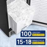This under counter ice maker provides cubes of uniform 0.9 in. x 0.9 in. x 0.9 in. size and shape that allows for attractive drink presentation and a slow melt rate so beverages won't water down quickly, ideal for daily use or a variety of entertaining needs. Ice production reaches up to 100 lbs. per day with a storage capacity of 33 lbs, ensuring a generous supply of fresh ice is conveniently at your fingertips. Each time you open the door, the bright blue LED lighting stylishly illuminates the interior. For hassle-free upkeep, this unit features an easily accessible control panel that lets you set ice thickness, self-cleaning mode, and auto-deicing at the touch of a button. Stainless steel offers a professional look for any location. The self-cleaning cycle makes routine maintenance easy. This unit comes with a cord and plug for simple installation.
