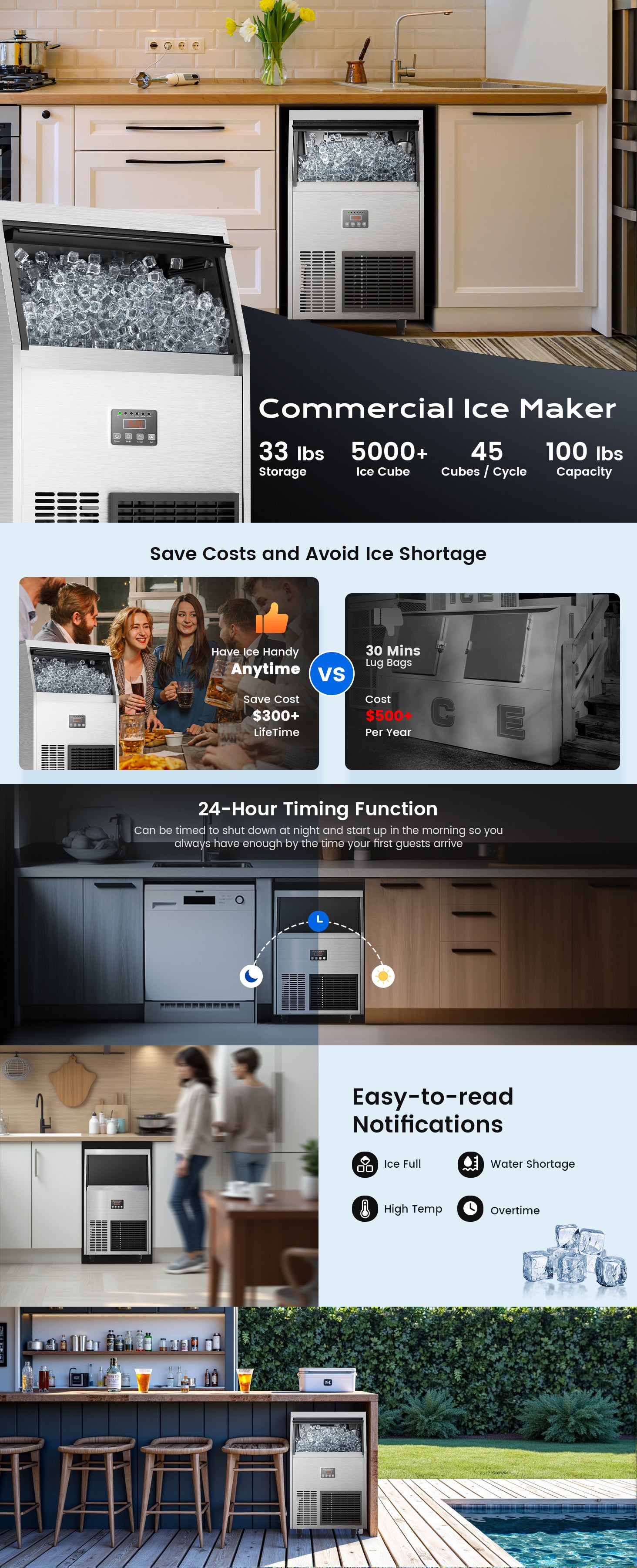 - Intense Ice Making Power: Capable of producing up to 100 lbs of ice in 24 hours and quickly making 45 pieces of clear ice cube in one cycle within 12-20 mins, this commercial ice maker has a powerful compressor that ensures a continuous supply of ice to chill drinks. Designed with a self-contained 33 lbs large storage capacity, it holds enough ice to be enjoyed by all.