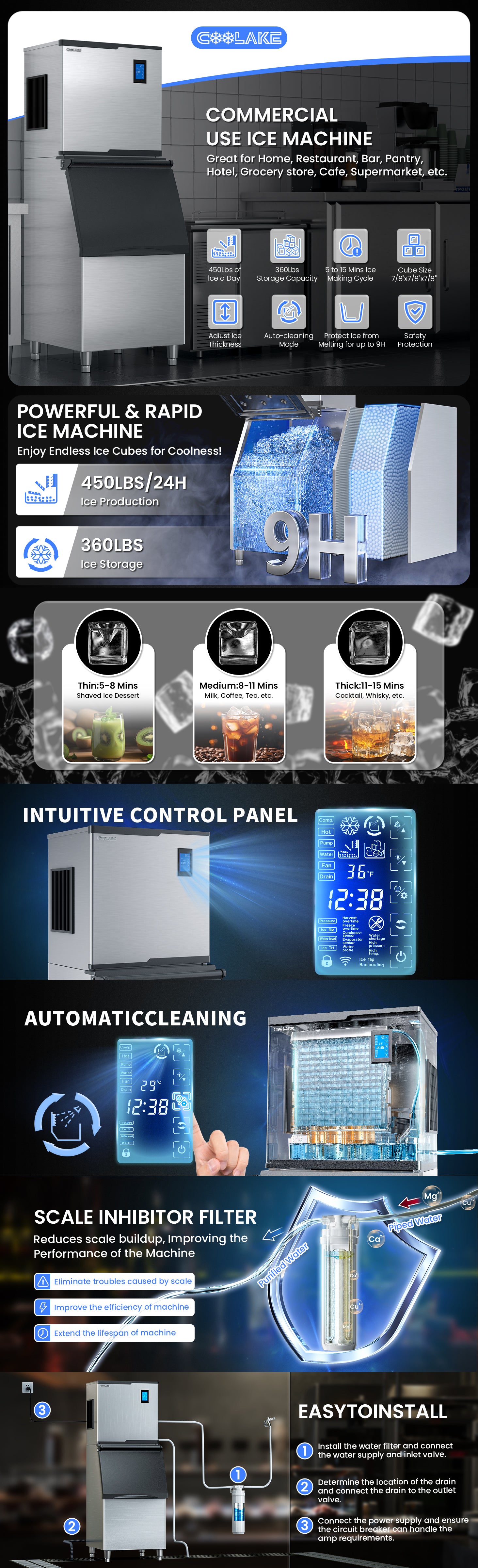 - 200 lbs Daily Ice Production: Using a high-efficiency R-290 compressor and air cooling, Coolake produces up to 200 lbs. of crystal clear ice daily, this unit will never leave you high and dry in the ice department and transform your home bar or kitchen into a haven for premium beverages. The interior self-contained ice bin can store up to 50 lbs. to help save you precious time and use ice without waiting.